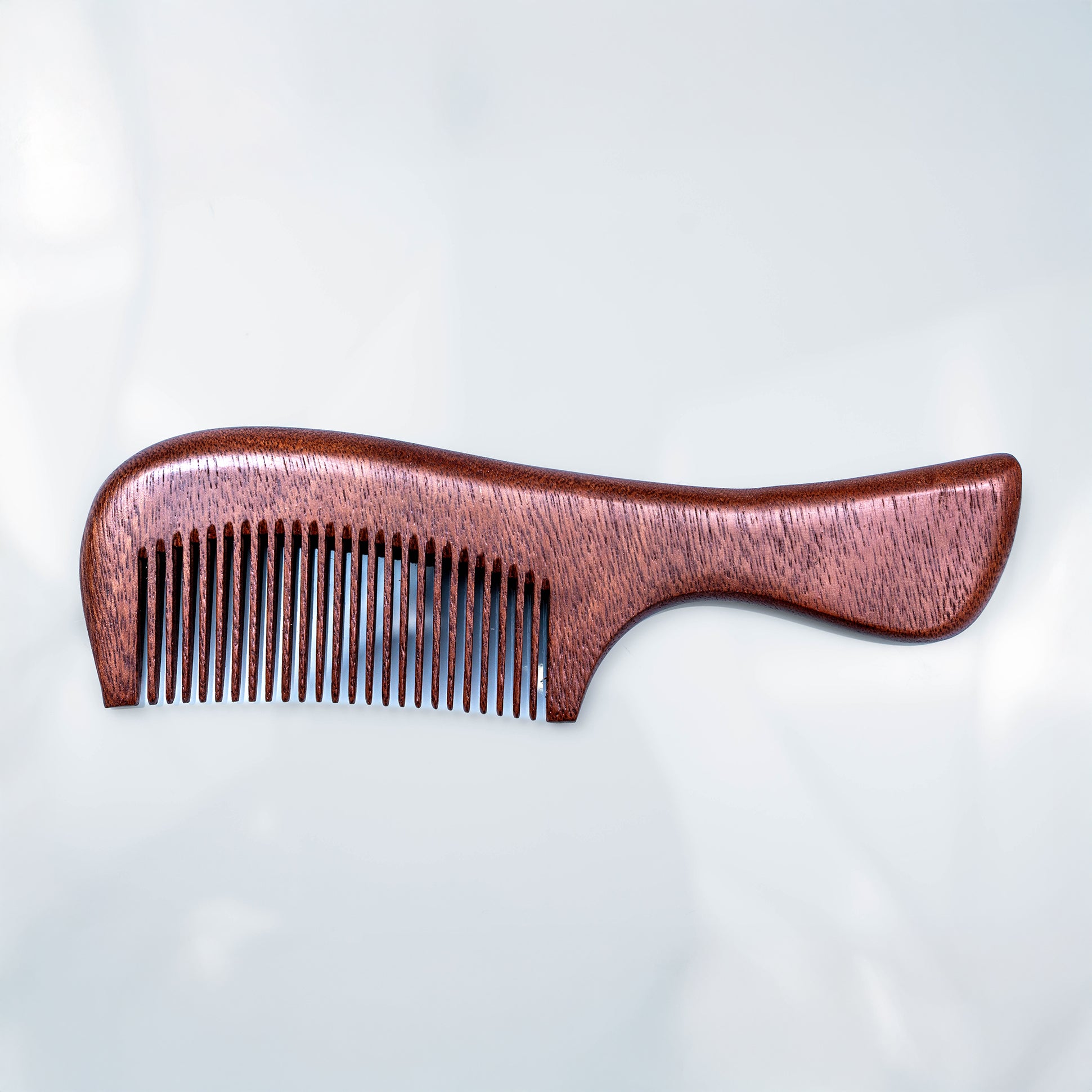 Handmade from natural red sandalwood, this comb features a smooth mustache-style handle for a steady grip and effortless control. Its medium teeth glide through your beard, helping to detangle, shape, and evenly distribute oils without pulling or snagging. A functional tool with a touch of character—perfect for daily grooming.